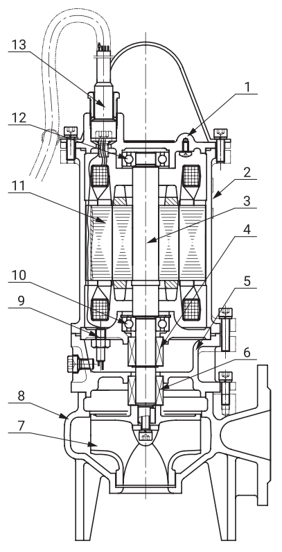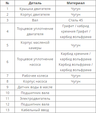 Масляное наполнение камеры уплотнения с датчиком утечки воды. Охлаждение двигателя в окружающую среду – перекачиваемую жидкость. Встроенные в статор датчики для предотвращения перегрева.