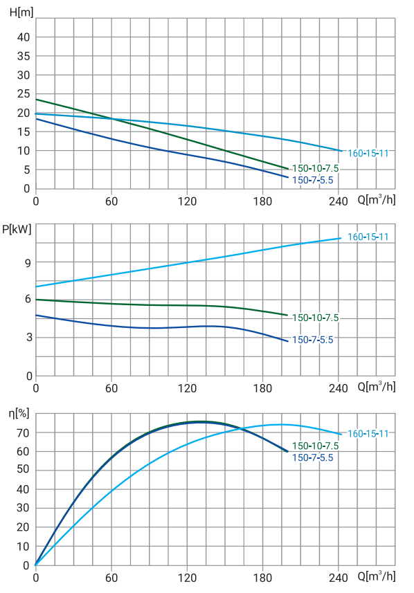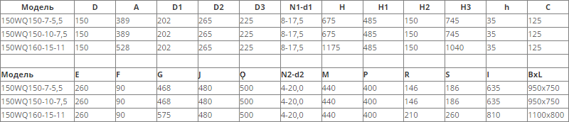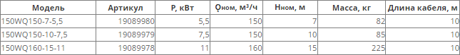 WQ – погружные канализационные насосы. Производительность находится в диапазоне от 15 до 160 м3/ч, напор – от 8 до 30 м. Мощность электродвигателя – от 1,1 до 11,0 кВт.