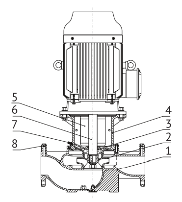 1. Корпус насоса 2. Рабочее колесо 3. Торцевое уплотнение вала 4. Основание двигателя 5. Защитный кожух 6. Вал 7. Винт выпуска воздуха 8. Заправочная пробка