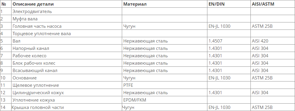 Насос состоит из основания и головной части. Промежуточные камеры и цилиндрический кожух соединены между собой, а также с основанием и головной частью при помощи стяжных болтов. Всасывающий и напорный патрубки находятся в основании насоса и расположены соосно (конструкция «ин-лайн»), что позволяет устанавливать насос на горизонтальном трубопроводе. Все насосы оснащаются необслуживаемым торцевым механическим уплотнением вала картриджевого типа.