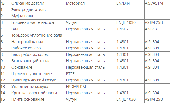Насос состоит из основания и головной части. Промежуточные камеры и цилиндрический кожух соединены между собой, а также с основанием и головной частью при помощи стяжных болтов. Всасывающий и напорный патрубки находятся в основании насоса и расположены соосно (конструкция «ин-лайн»), что позволяет устанавливать насос на горизонтальном трубопроводе. Все насосы оснащаются необслуживаемым торцевым механическим уплотнением вала картриджевого типа.