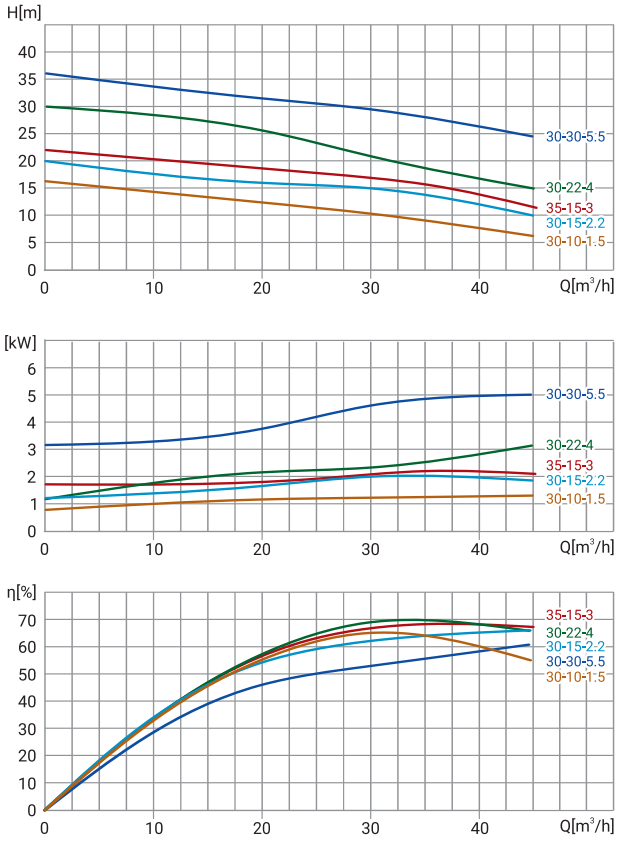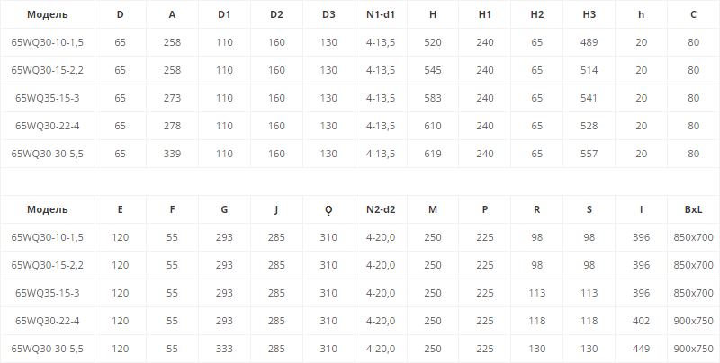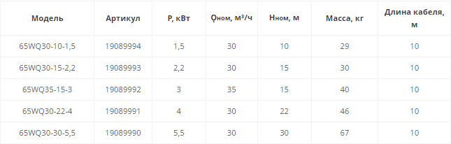 WQ – погружные канализационные насосы. Производительность находится в диапазоне от 15 до 160 м3/ч, напор – от 8 до 30 м. Мощность электродвигателя – от 1,1 до 11,0 кВт.