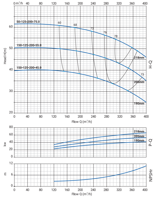 Размеры и номинальные характеристики соответствуют стандарту EN 733. Подача насосов составляет от 0 до 500 м3/ч, напор от 0 до 131 м.
