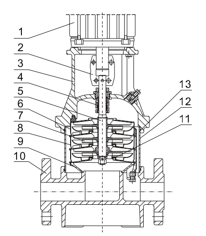 Насос состоит из основания и головной части. Промежуточные камеры и цилиндрический кожух соединены между собой, а также с основанием и головной частью при помощи стяжных болтов. Всасывающий и напорный патрубки находятся в основании насоса и расположены соосно (конструкция «ин-лайн»), что позволяет устанавливать насос на горизонтальном трубопроводе. Все насосы оснащаются необслуживаемым торцевым механическим уплотнением вала картриджевого типа.