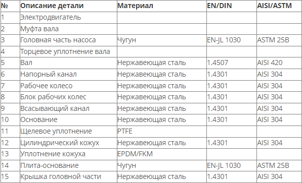 Насос состоит из основания и головной части. Промежуточные камеры и цилиндрический кожух соединены между собой, а также с основанием и головной частью при помощи стяжных болтов. Всасывающий и напорный патрубки находятся в основании насоса и расположены соосно (конструкция «ин-лайн»), что позволяет устанавливать насос на горизонтальном трубопроводе. Все насосы оснащаются необслуживаемым торцевым механическим уплотнением вала картриджевого типа.