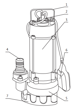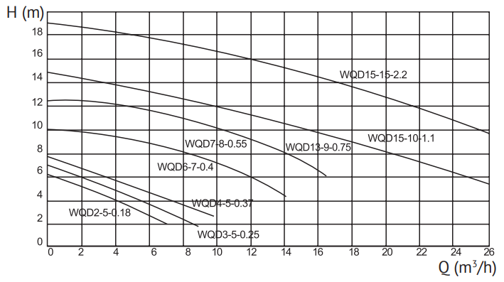 Насосы WQD представляют собой одноступенчатый погружной агрегат с вертикальным нагнетательным патрубком. Корпус насоса выполнен из чугуна, корпус двигателя насоса выполнен из нержавеющей стали. Рабочее колесо вихревого типа выполнено из чугуна. Торцевое уплотнение - карбид кремния/графит. Открытая конструкция рабочего колеса обеспечивает свободный проход твердых частиц диаметром до 20 мм. Насос может работать только полностью погруженным в перекачиваемую жидкость. Для автоматического управления работой насоса, он укомплектован поплавковым выключателем, который осуществляет автоматическое включение и выключение насоса.