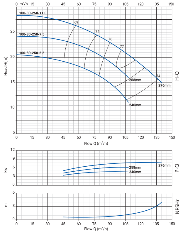 Размеры и номинальные характеристики соответствуют стандарту EN 733. Подача насосов составляет от 0 до 500 м3/ч, напор от 0 до 131 м.