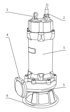 1. Подъемная скоба 2. Кабельный ввод 3. Двигатель насоса 4. Напорный патрубок 5. Корпус насоса 6. Опора насоса