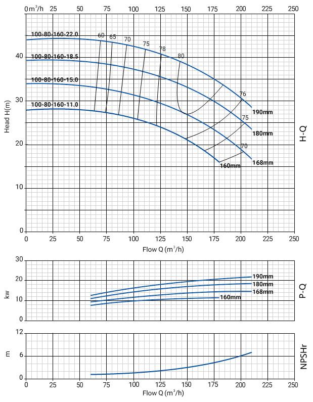 Размеры и номинальные характеристики соответствуют стандарту EN 733. Подача насосов составляет от 0 до 500 м3/ч, напор от 0 до 131 м.