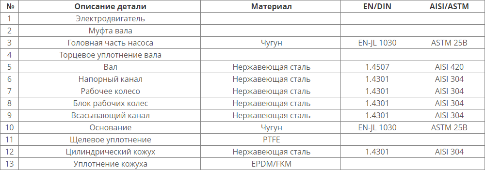 Насос состоит из основания и головной части. Промежуточные камеры и цилиндрический кожух соединены между собой, а также с основанием и головной частью при помощи стяжных болтов. Всасывающий и напорный патрубки находятся в основании насоса и расположены соосно (конструкция «ин-лайн»), что позволяет устанавливать насос на горизонтальном трубопроводе. Все насосы оснащаются необслуживаемым торцевым механическим уплотнением вала картриджевого типа.